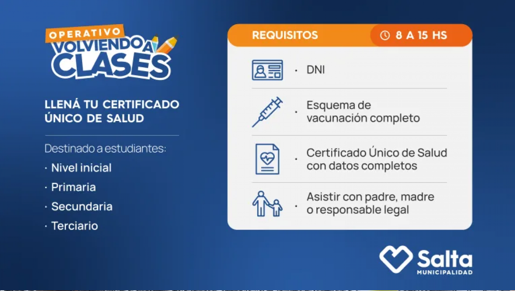 La atención será por orden de llegada y los requisitos son: presentación del DNI, esquema de vacunación y formulario con los datos de cada alumno completados previamente.